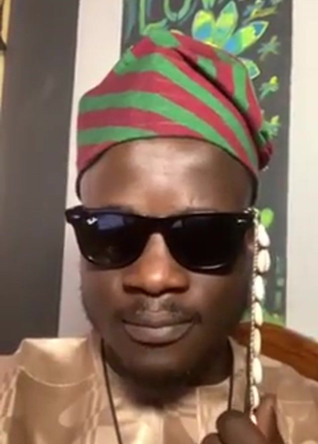 A man with dark skin is centered in the frame. He wears dark sunglasses and a patterned cap with green and burgundy stripes. The cap appears to be slightly tilted to one side. He is wearing a tan shirt with a pattern of squares and vertical lines. He is also wearing a necklace made of small, white shells. Behind him is a wall with a piece of artwork that says "LOVE" in bold letters with green and blue accents. The background is slightly blurry, suggesting a shallow depth of field. The man appears to be looking directly at the camera with a neutral expression. There is music playing in the background.