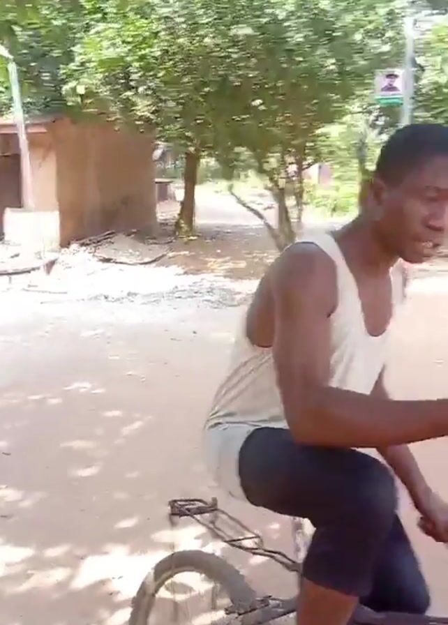 A young Black man is sitting on a bicycle outdoors. He's wearing a light-colored tank top and dark pants. He looks directly at the camera while speaking, then turns his head to his right. The bicycle is fairly simple, with a rack on the back. The setting is a dirt area with trees and a building in the background. There is a light post nearby with a poster on it.