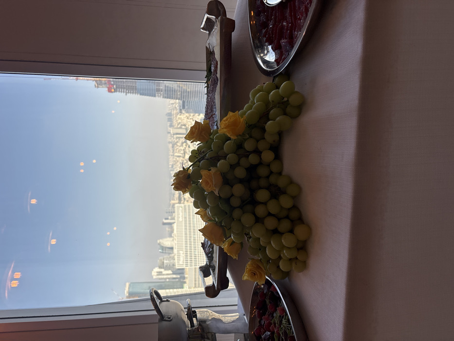 The image displays a buffet setup situated on a high floor, offering a panoramic view of Tel Aviv, Israel, through large windows. The Azrieli Sarona Tower, identifiable by its construction crane, is visible on the right against a clear blue sky. In the foreground, a table draped with a light-colored tablecloth features a prominent arrangement of green grapes adorned with yellow roses as a centerpiece. To the left, a silver chafing dish with a lid rests on a stand, adjacent to an oval silver platter containing dark berries and green herbs. To the right, a rectangular wooden serving tray holds slices of cured meat garnished with green sprigs, positioned next to another oval silver platter containing thinly sliced red meat. No individuals are present in the frame.