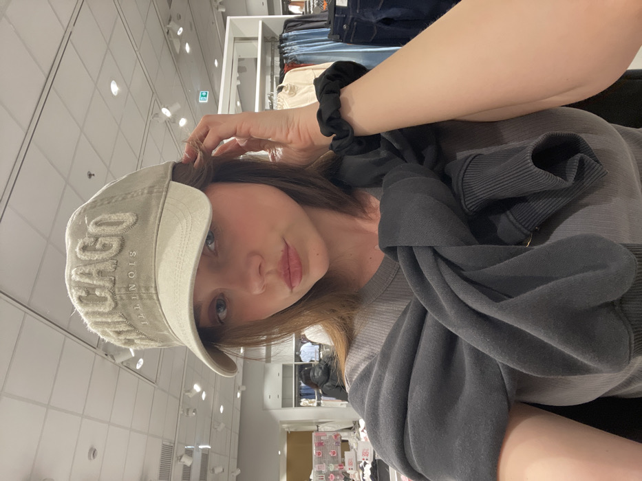 A young woman is depicted in a close-up, chest-up view, facing the camera directly. She wears a light beige baseball cap with "CHICAGO ILLINOIS" embroidered in a textured, raised style on the front. Her light brown hair falls around her shoulders, partially covered by the cap. She has light eye makeup and a slightly pouting expression with tinted lips. Her right hand is positioned near her temple, touching her hair. On her left wrist, she wears a black scrunchie. She is dressed in a ribbed, grey t-shirt or tank top, with a dark grey or black sweatshirt tied around her shoulders and chest. The background reveals the interior of a modern retail clothing store. Overhead, a grid ceiling with various white track lights and recessed lighting fixtures is visible. To the right, white shelving units display folded clothing items and clothing racks hold garments such as jeans and blouses. To the far left, another indistinct figure is visible in the background near more displays of clothing. A green emergency exit sign with a white pictogram is mounted on a pillar or wall in the middle-right background. The overall lighting is bright and artificial, consistent with an indoor commercial space. The scene is located in the city of Pompei, Italy.