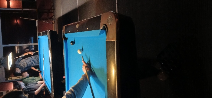 This image captures an indoor billiards hall
