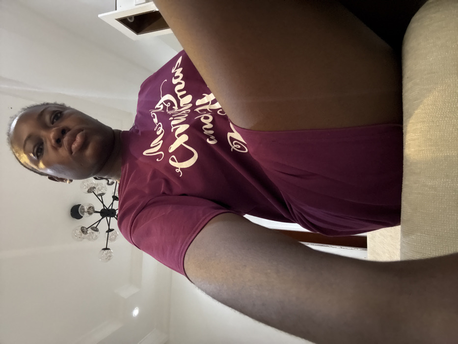 A person with short hair wears a maroon t-shirt with light-colored script