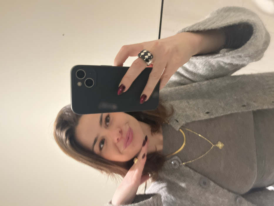 A woman is taking a mirror selfie, holding a black smartphone with both hands. She is wearing a grey cardigan over a grey top with a delicate gold necklace. A striking black and white checkered ring adorns the hand holding the phone. Her nails are painted a dark burgundy color. Her hair is shoulder-length and brown. She is smiling softly.