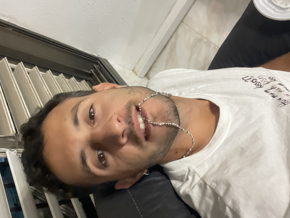 The image depicts a single adult male, appearing to be in his 20s to 30s, seated indoors. He has short dark hair, visible facial stubble, and brown eyes, looking directly at the camera. He is wearing a white short-sleeved crew-neck t-shirt with text on the lower right side that reads "How many kisses?" and partially visible "kisses" below it. Small silver-colored hoop earrings are present in both ears. The individual is holding a silver-colored, textured chain, resembling a barbed wire design, between his teeth. The chain hangs from his mouth, draping across his chin and partially visible neck. He is seated on a dark-colored, possibly leather, chair or sofa. The background consists of a window fitted with horizontal louvered blinds (jalousies) on the upper right, and a plain white wall below and to its right. A light-colored floor, possibly tiled, is visible on the lower right. The scene is illuminated by artificial light. The location is an indoor room in the city of Unknown, Unknown.