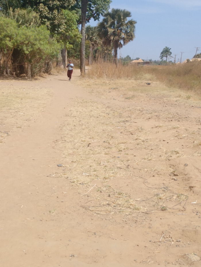 The image depicts a semi-rural landscape in Kpak, Nigeria, under a clear, light blue sky