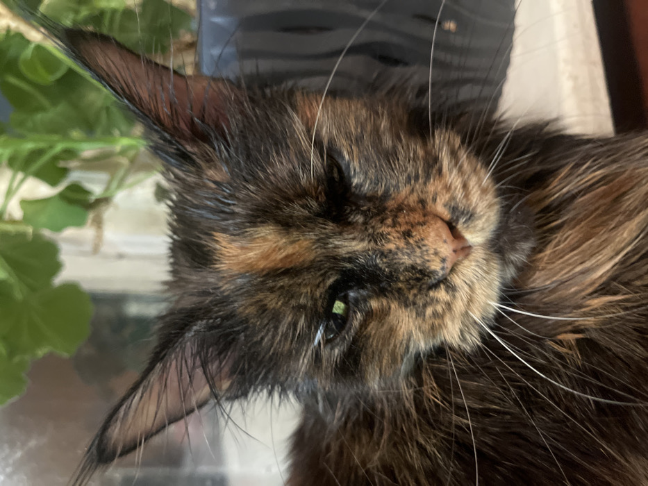 A close-up, rotated view of a tortoiseshell cat. The cat's face is partially visible, displaying a mix of black, brown, and orange fur. Prominent features include pointed ears, long white whiskers, and one visible green eye. The cat appears to be resting, with its head tilted. A green plant and part of a window are blurred in the background, suggesting an indoor setting. The overall image has a soft, natural light.