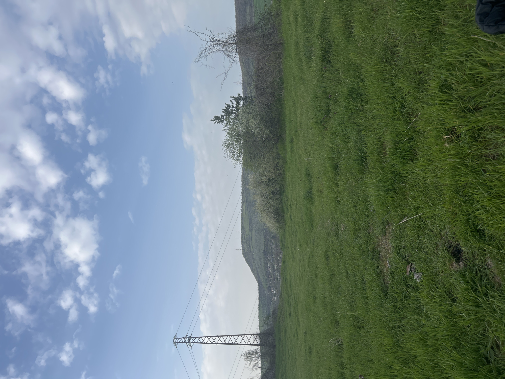 landscape in Cherven Bryag, Bulgaria. A grassy field occupies the right half of the frame. A tree line and a hill are positioned behind the field. An electrical transmission tower and lines are visible on the left side, extending into a cloudy sky.