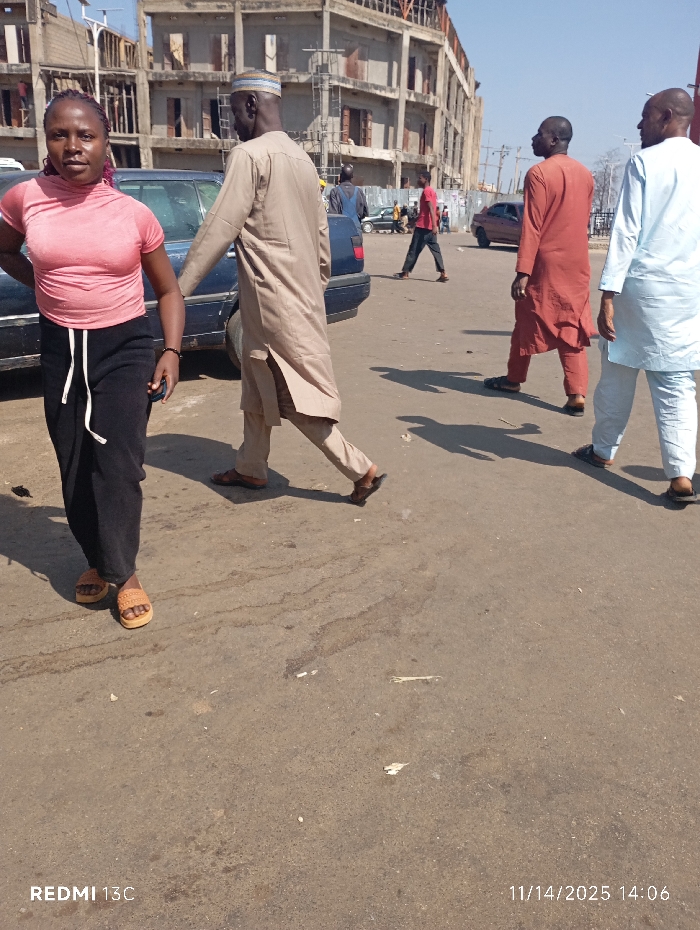 A street scene shows a woman in a pink top and black pants standing near a dark car. A man in a tan robe walks alongside the car. Further back, two other men in robes stroll in the same direction. Additional individuals and cars are visible in the background, along with a partially constructed building. The ground is asphalt with visible wear and markings. The timestamp "11/14/2025 14:06" and "REDMI 13C" are printed on the bottom of the frame.