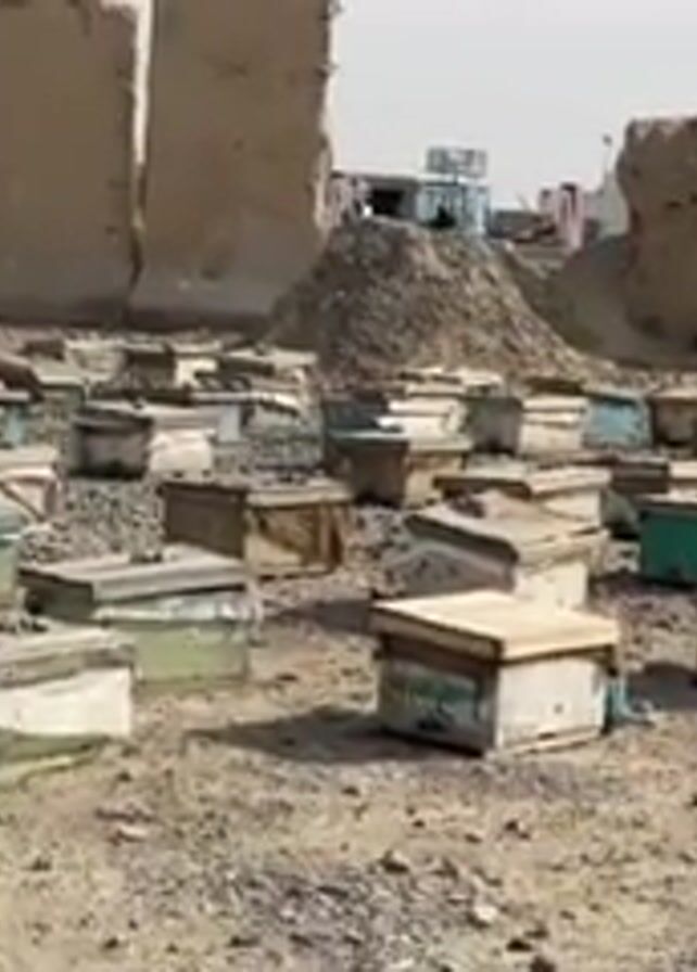 large collection of beehives scattered across a dry, dusty landscape. The beehives are rectangular and painted in various colors like green, blue, and white. In the background, there are remnants of what appear to be old walls or structures, along with a mound of dirt or debris. In the distance, some vehicles and people can be seen moving along a road. The overall scene gives the impression of a rural or agricultural setting, possibly in a desert or arid region.