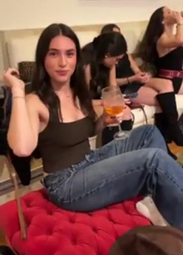 young woman sitting on a red tufted ottoman, casually dressed in jeans and a tank top, holding a stemmed glass with an orange-colored beverage. She is smiling and gesturing with her free hand. Behind her, two other women are seated on a white sofa. One woman is looking down at something in her hands, possibly a phone, while the other is leaning back, seemingly stretching or yawning. In the foreground to the right, part of a brown fedora is visible. The background features a neutral-colored wall with a framed picture. The lighting is warm, suggesting an indoor setting in a relaxed, informal atmosphere.