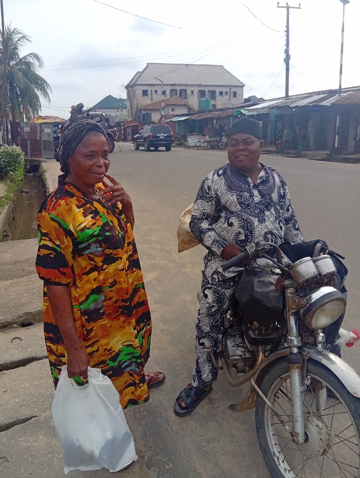 The image depicts a street scene in Aba, Nigeria, under an overcast sky. In the foreground, two individuals are positioned on a paved road with a concrete sidewalk and gutter system to the left. On the left, a middle-aged to elderly woman with dark skin and dark braided hair is standing, facing forward and slightly to her right. She wears a loose, short-sleeved garment patterned in yellow, orange, black, and green, and pink sandals. Her left hand holds a white plastic bag, while her right hand is raised to her chin. She is smiling. To her right, a middle-aged man with dark skin is seated on a motorcycle, also facing forward and slightly to his left. He wears a dark cap and a patterned traditional outfit in black and white/grey, with black sandals. He is also smiling. The motorcycle is an older model with a black fuel tank, chrome headlight, and visible engine components. A white chicken with red comb is perched on the front fender near the headlight, and a light brown sack is visible behind the man, likely on the motorcycle's rear. In the mid-ground, a dark sport utility vehicle (SUV) is parked on the road. The background features various structures, including a prominent light-colored, multi-story building with multiple windows and a distinct roofline, likely commercial or residential. To the right, a series of market stalls or shops with corrugated metal roofs line the street. Utility poles with overhead wires are also visible. A palm tree and other sparse vegetation are present on the far left.