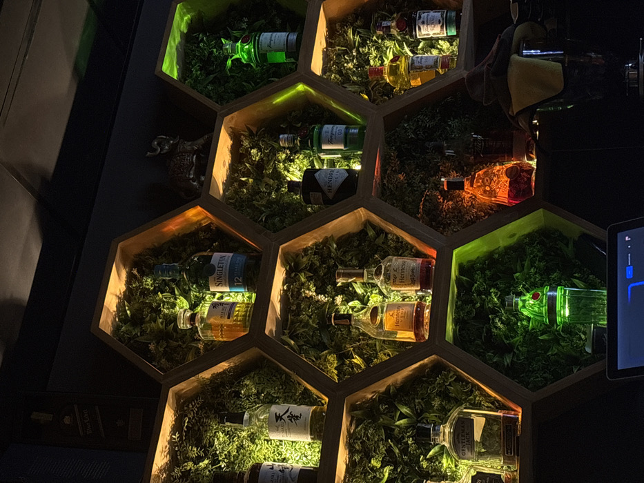 The image displays an interior bar setting located in Dupnitsa, Bulgaria. A prominent feature is a wall-mounted display system composed of interlocking hexagonal wooden shelves. Each hexagonal compartment is filled with artificial green foliage and illuminated by integrated LED lighting, which produces amber, green, and warm white light accents. Various bottles of alcoholic beverages are systematically arranged within these illuminated hexagons. Identifiable brands include Johnnie Walker Blue Label (partially visible box, upper left), Yamazaki (or similar Japanese whisky), Singleton 12-year-old whisky, Tanqueray gin (multiple bottles, one used as a green illuminated shaker), Hendrick's Gin, Hennessy cognac (multiple bottles), Gentleman Jack whisky, and a bottle resembling Chivas Regal Royal Salute. An ornamental metallic elephant figurine rests on a shelf in the upper-central portion of the display. The environment is dimly lit, suggesting a nighttime or low-light setting. In the foreground, at the bottom left, the top portion of a laptop screen is visible on a dark counter. To its right, a green illuminated cocktail shaker stands on the counter, with a dark fabric or towel draped over an obscured object further to the right. No individuals are present within the scene.