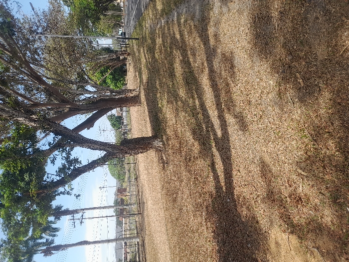 The image displays an outdoor environment in Taguanes, Venezuela, under a clear sky with scattered clouds. The foreground consists of dry, light brown grass and dirt, interspersed with fallen leaves and small twigs. Multiple elongated shadows from trees are cast across this area. A row of mature trees with gnarled, light-colored trunks and green foliage forms a prominent feature, extending from the midground towards the background on the left. The tree closest to the viewer exhibits a distinct V-shaped trunk formation. To the right of the treeline, a paved road runs parallel, with a tall, thin streetlamp pole standing alongside it. In the distance on the road, a dark-colored vehicle is partially visible. The background, beyond the immediate treeline, reveals a metal wire fence with posts, followed by multiple power poles with overhead lines, additional distant trees, and faint outlines of structures or buildings. Tall, slender palm-like trees are present on the far left horizon. No people or animals are visible in the scene.