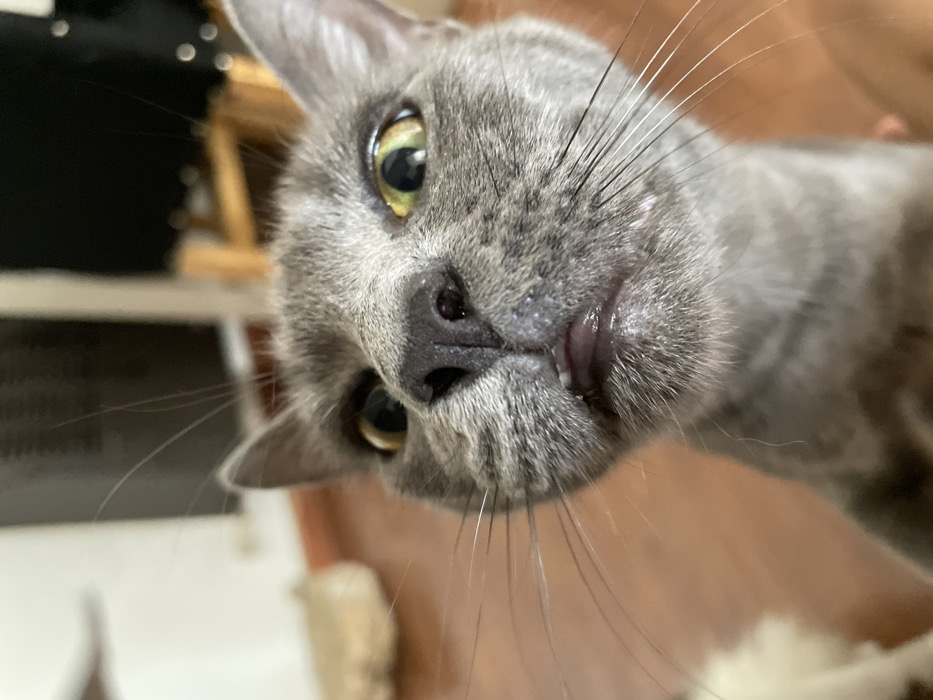 - "A close-up, low-angle forensic image depicts the head and upper torso of a gray domestic shorthair cat, centered in the frame" by FM-BT1Sm1, licensed under CC BY 4.0