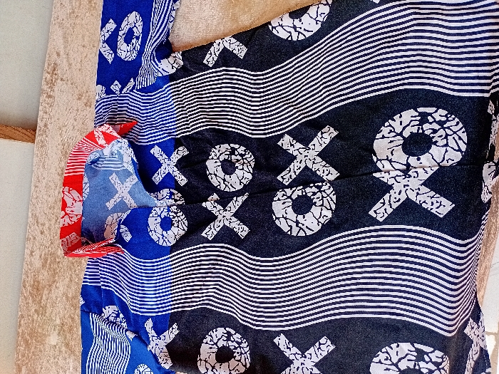 An overhead view captures a long-sleeved garment, likely a shirt or tunic, laid flat on a light beige, textured surface. The garment features a multi-paneled design. The central body is dark blue or black, adorned with large, abstract white "X" and "O" motifs interspersed with vertical, wavy white and thin dark blue stripes. The collar is patterned in red and white, displaying an abstract, organic design. The upper shoulder and sleeve sections are a royal blue with white horizontal stripes and fragmented white "O" shapes. The fabric appears to be cotton or a similar textile. The visible environment is an indoor setting, with the textured surface possibly being a bedspread, tablecloth, or similar fabric-covered surface. No individuals are present, and no actions or interactions are depicted.