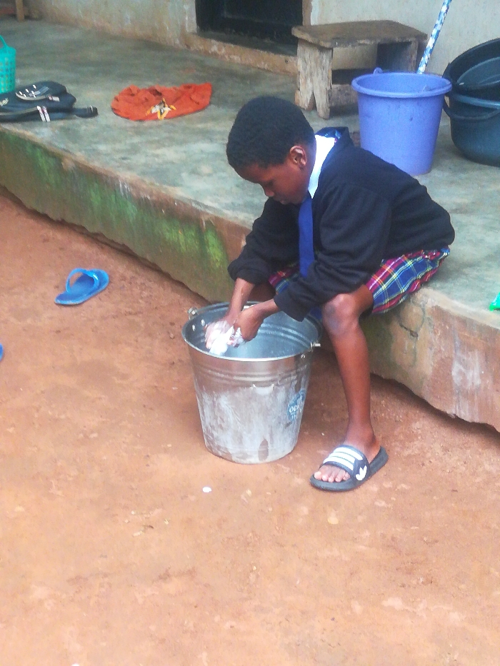 A young dark-skinned male, appearing to be a boy, is depicted performing laundry outdoors in the city of Unknown, Unknown