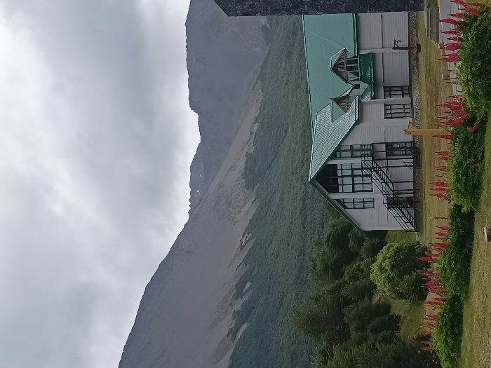 This image depicts a landscape in Ushuaia, Argentina, under an overcast sky. In the background, a large, dark grey mountain range dominates, with its upper slopes appearing rocky and barren, transitioning to dense evergreen forest on the lower elevations. The mid-ground features a multi-story building with white horizontal siding and a prominent green corrugated metal roof. The building exhibits an A-frame architectural style on its left section, featuring numerous large vertical windows. An external black metal staircase ascends to an upper entrance on the left side of the building. To the right, the building continues with additional windows and a smaller dormer section on the roof. A darker, possibly stone or concrete structure partially obscures the main building on the far right edge of the frame. The foreground consists of a grassy area, interspersed with multiple beds of tall, reddish-pink flowering plants, likely lupines. A yellow wooden post or sign is visible behind the flowers, near the building's center-right. No individuals or active interactions are observable within the frame.