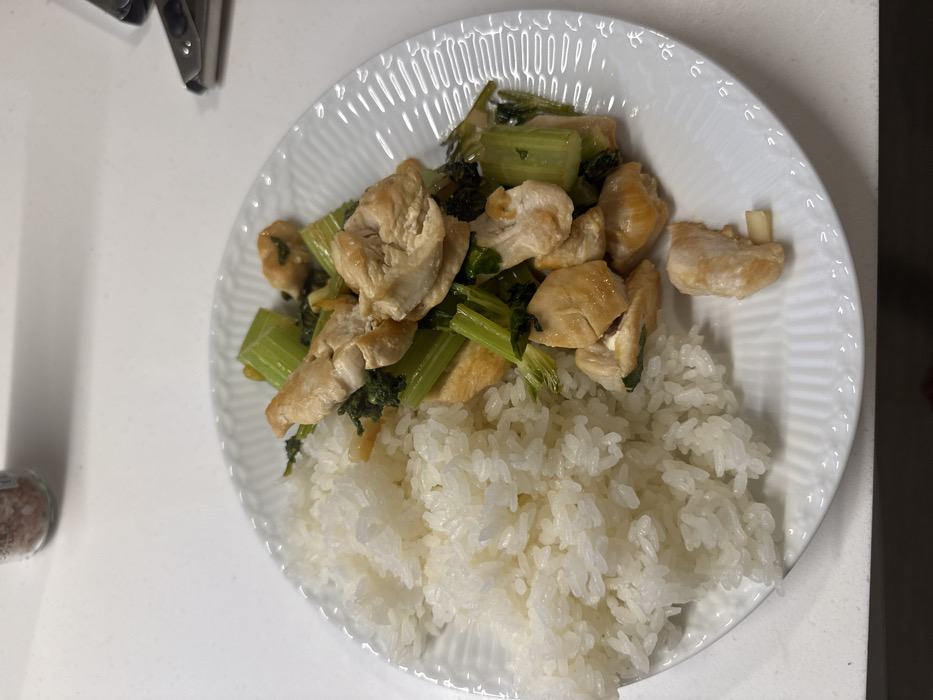 - "A white plate holds a portion of chicken stir-fry with rice" by FM-iAQ8L2, licensed under CC BY 4.0