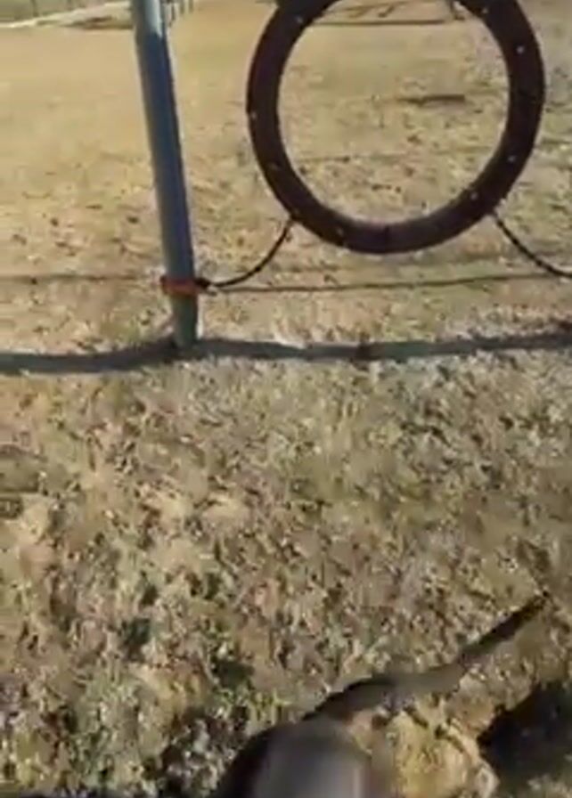 black dog jumping through a circular hoop at a dog park. The dog is wearing a light green collar. The hoop is suspended between two gray poles with orange accents. The dog park has a sandy ground and is surrounded by a chain-link fence. Beyond the fence are houses and a few picnic tables. The sky is clear and blue. The video appears to be taken at the dog's eye level.