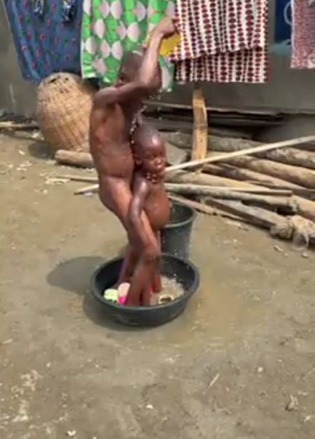 Two young, shirtless, dark-skinned children are standing in a black plastic tub outside. An older child is pouring water from a yellow plastic container over the younger child. Clotheslines with colorful clothes hang behind them. There's a basket to the left, and firewood to the right. The ground is dirt.