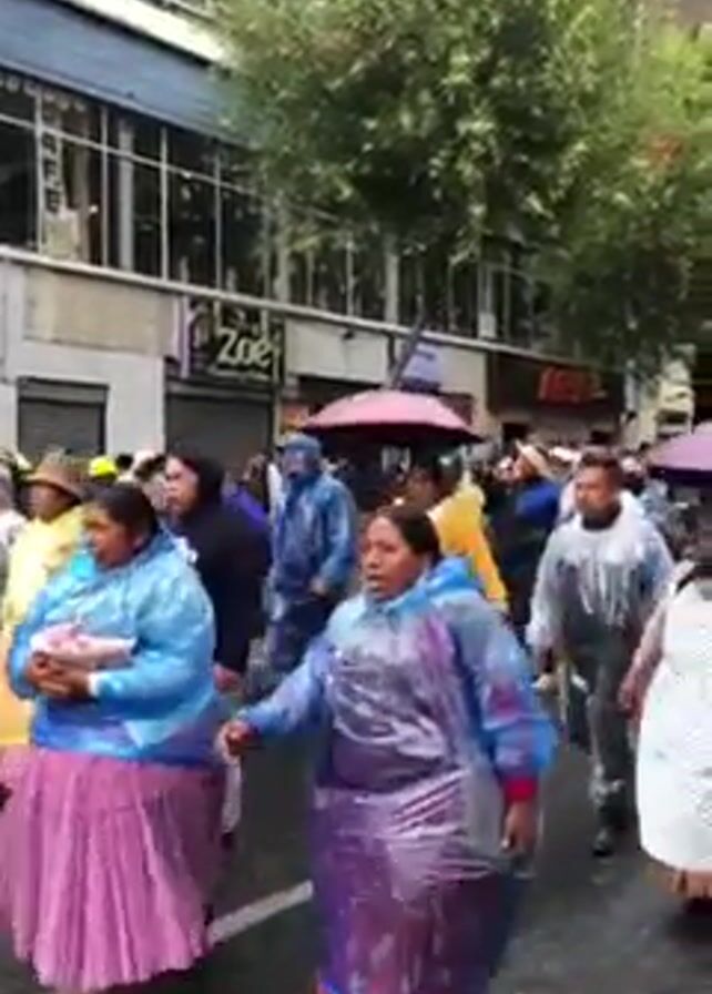 A group of people are marching in what appears to be a parade or protest. They are on a city street, and it appears to be raining, as many of the marchers are wearing plastic ponchos or holding umbrellas. Some are dressed in traditional clothing, including colorful skirts and tops, while others are wearing casual clothing. Some are chanting or singing. The street is lined with buildings and trees, and there is a sign for "Zoe's Cafe" visible in the background.