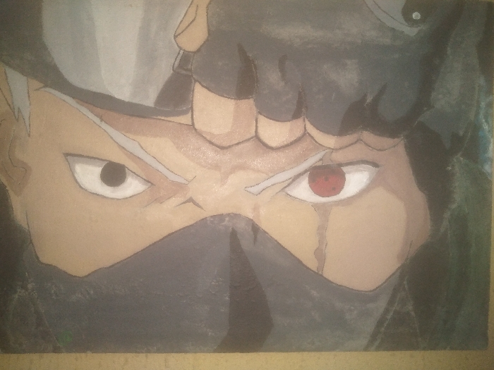 A close-up painting depicts Kakashi Hatake from the anime Naruto