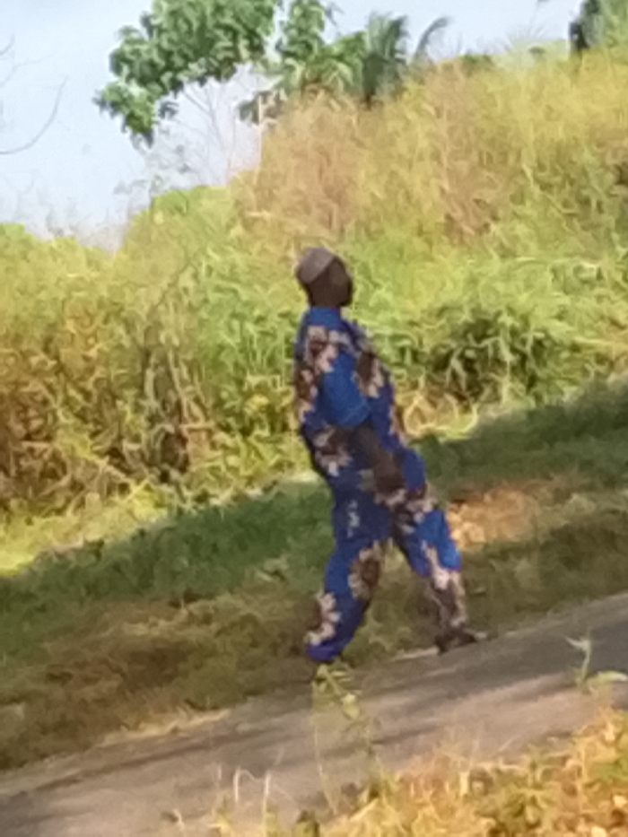 The image displays an outdoor scene in Ogbomosho, Nigeria, featuring a single adult male. The man, observed from a slightly elevated vantage point, is walking towards the right side of the frame, with his left leg extended forward and his right leg trailing. He wears a loose-fitting, full-body garment, predominantly blue with a repeating lighter-colored pattern, possibly floral or abstract. A light-colored cap covers his head, and dark footwear is visible on his feet. He is positioned on a dark-colored path or road segment that appears to be paved or compacted dirt, sloping gently downwards from left to right across the lower half of the frame. The background consists of dense, varied vegetation, featuring shades of green and yellowish-brown grasses and shrubs. Taller green trees are visible against a light blue to white sky in the upper background. No other individuals or objects are discernible, and no interactions are taking place.