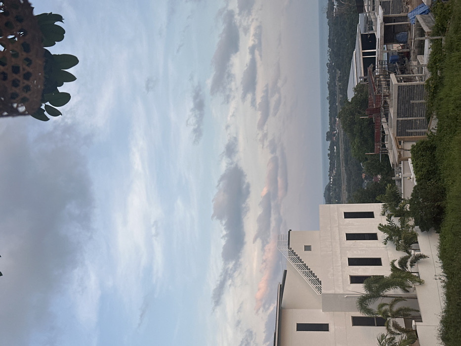 The image displays an elevated view of a landscape in บ้านบางรักษ์, Thailand, under a partly cloudy sky. The sky features stratocumulus clouds in shades of light blue, grey, and faint pink. In the upper right foreground, a portion of a woven basket with green leaves is visible, hanging. The lower foreground consists of dense green foliage, consistent with overgrown bushes and grass on a slope. The midground is dominated on the left by a modern, multi-story, white or off-white building with multiple dark, vertically oriented rectangular windows. An external white staircase with railings ascends the right side of this structure to an upper level. Several palm trees are situated near the building's base, partially obscured by a low white retaining wall. To the right of the prominent building, an active construction site is visible, containing unfinished concrete structures, exposed rebar, scaffolding, and various building materials, including a blue tarp. The background presents a horizontal band of blue water, indicating an ocean, meeting a distant landmass. This landmass includes scattered structures, patches of vegetation, and a flat, open area, possibly an airstrip or large field. No people are visible within the frame.