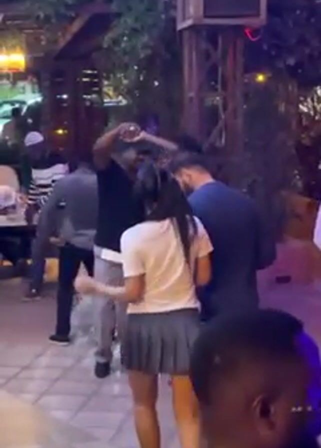 The scene is a lively outdoor party setting, with several people dancing to music under an awning decorated with greenery and colorful lights