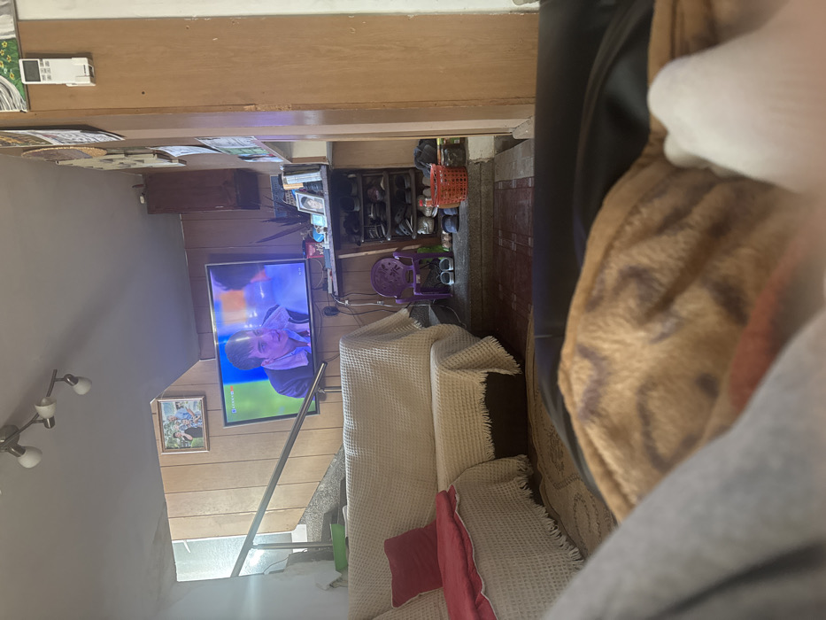 The image depicts an indoor domestic environment in Galiche, Bulgaria, viewed from a low perspective, likely from a seated position on furniture. In the immediate foreground, a blurred, brown and black patterned blanket covers an unseen surface, with a glimpse of white fabric to the far right. In the midground, a light-colored, cream-woven sectional sofa with a red cushion on its left section occupies the left side of the frame. A patterned rug in neutral tones lies on the floor in front of the sofa. A metal handrail is visible, extending diagonally upwards towards the left, indicating a staircase. The background reveals a room with light brown horizontal wood paneling on the walls. A flat-screen television is mounted on the paneled wall, displaying a program featuring a male subject with a distressed expression against a blue and green background, with a "Nova" channel logo visible. Above the television, a framed picture of multiple individuals is hung. To the right of the television, a dark, multi-tiered shoe rack contains numerous pairs of shoes. Various objects, including framed photos and a plant, are arranged on top of this unit. A small, purple plastic child's chair is positioned on the floor below the shoe rack, with additional shoes and a red plastic basket nearby. A white remote control unit is affixed vertically to the right-most wall. The ceiling is white, featuring a track light fixture with three spotlights. The staircase continues upwards to the left, with an apparent window or opening beyond it. The flooring near the shoe rack appears to be tiled or concrete, distinguishing it from the rug. No individuals are clearly visible except those on the television screen.
