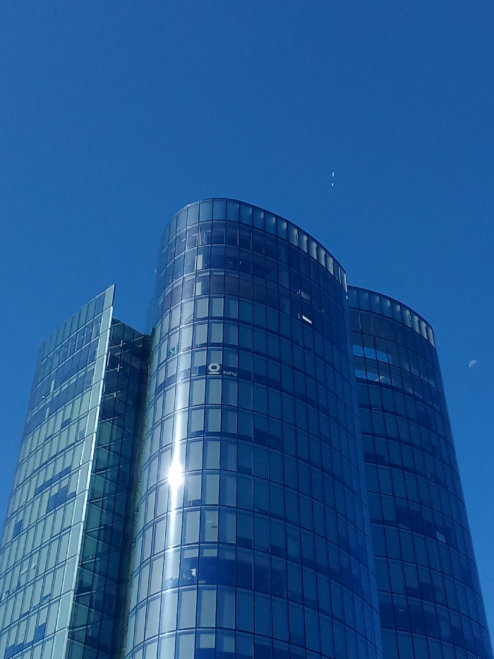 A low-angle shot reveals a modern, high-rise building against a clear blue sky. The building's facade is primarily glass, reflecting the sunlight. Its design features curved edges and a distinct structure, with sections of different heights. A logo is visible on one part of the building, and the moon is seen in the sky to the right of the building.