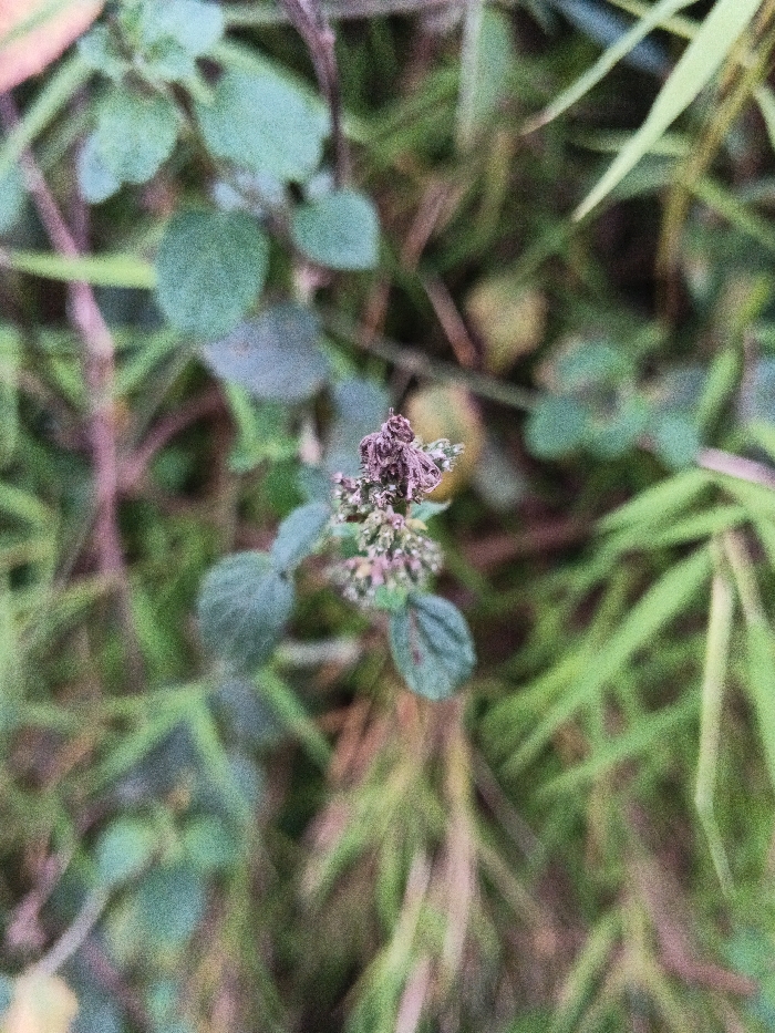 A close-up, high-angle view captures a small plant with a central cluster of tiny, light purple and pink flower buds, topped by a dried, dark purple-brown floral structure. The plant exhibits small, round to ovate green leaves with visible venation. Surrounding the central subject is a dense, out-of-focus background of various green foliage, including slender grass blades and broader leaves, with hints of reddish-brown stems and dried vegetation. The scene is static, devoid of human presence or activity, and is located in the city of Pinnwe, Myanmar (Burma).