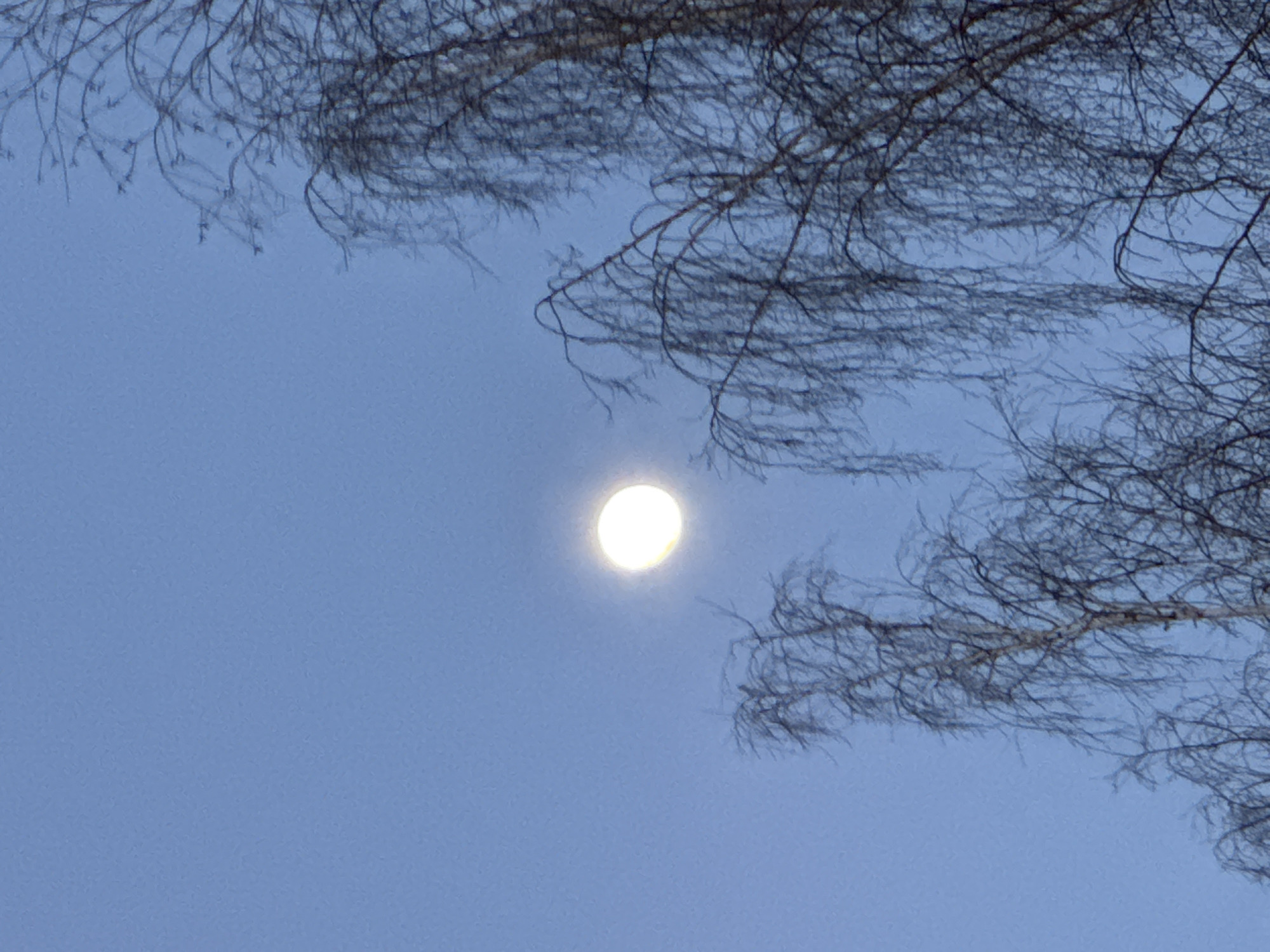 view of the sky, featuring a bright circular object (likely the moon) positioned between the branches of trees