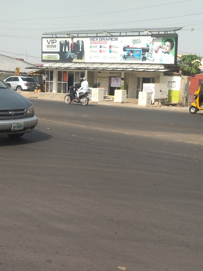 street scene in New Karu, Nigeria, located at coordinates 8.998 latitude and 7.571 longitude. A billboard above a storefront reads "Rex Graphics - Printing Press" and features a man in a suit and a young boy. There are two men on a motorcycle, one wearing a white shirt and the other wearing a black shirt. A car and a small pickup truck are parked on the side of the street. The road appears to be paved and there is a sidewalk on the right side of the street. The storefront appears to be a business selling clothes. The sky is clear and the sun is shining.