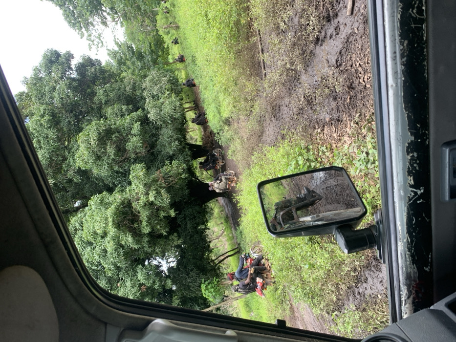 The scene depicts a rural or semi-rural area within the city of Akayar, Nigeria, observed from the interior of a vehicle. The foreground shows the vehicle's window frame, door panel, and a side-view mirror reflecting muddy ground and a person's boot. The midground features a heavily rutted, muddy dirt path flanked by dense green vegetation, including tall grass and undergrowth. In the background, several large, deciduous trees with full green canopies provide shade. Under and around these trees, a group of approximately 10-15 individuals are present, with at least eight motorcycles. Most motorcycles carry two occupants. One motorcycle on the left has a driver wearing a dark shirt and a red bandana, with a passenger carrying a backpack with red accents. Other individuals are dressed in dark or camouflage-patterned clothing. Some are seated on motorcycles under the trees, while others are positioned on a gentle, grassy slope to the right of the track. The sky above is overcast.