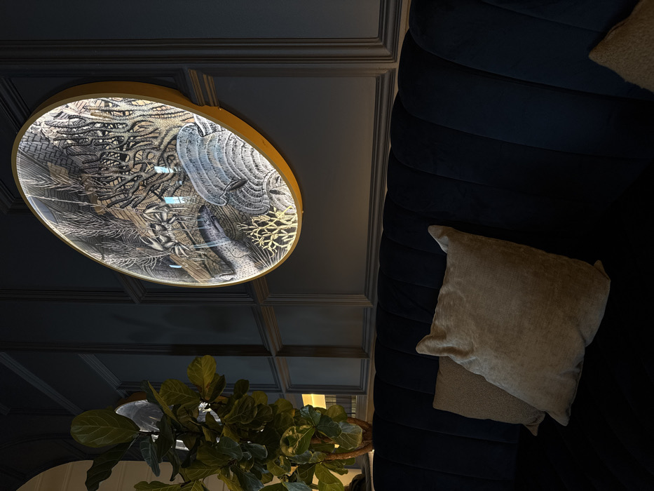 The image depicts an upscale interior scene, identified as being located in Budapest, Hungary. No individuals are present. The focal point is a large, circular, backlit art installation prominently displayed on a dark, paneled wall. The artwork is contained within a gold-toned frame and features an intricate, illustrative depiction of an organic environment, possibly underwater or a dense natural landscape, characterized by complex coral-like structures, various flora, and a large, textured mollusk shell or similar marine form in the foreground. The internal backlighting provides the primary illumination for the artwork. Below the artwork and extending across the lower portion of the frame is a section of a dark blue or black velvet sofa. The sofa exhibits vertical channel tufting along its backrest. Two rectangular throw pillows are placed on the sofa; the most prominent is a light tan or beige pillow with a subtle textured finish, positioned in front of a slightly darker, partially visible pillow. To the left side of the frame, a large, potted Fiddle-leaf fig plant (*Ficus lyrata*) with broad, dark green leaves and visible brown stems is positioned, partially obscuring the dark paneled wall. The overall environment is dimly lit, with the illuminated artwork providing a significant light source.