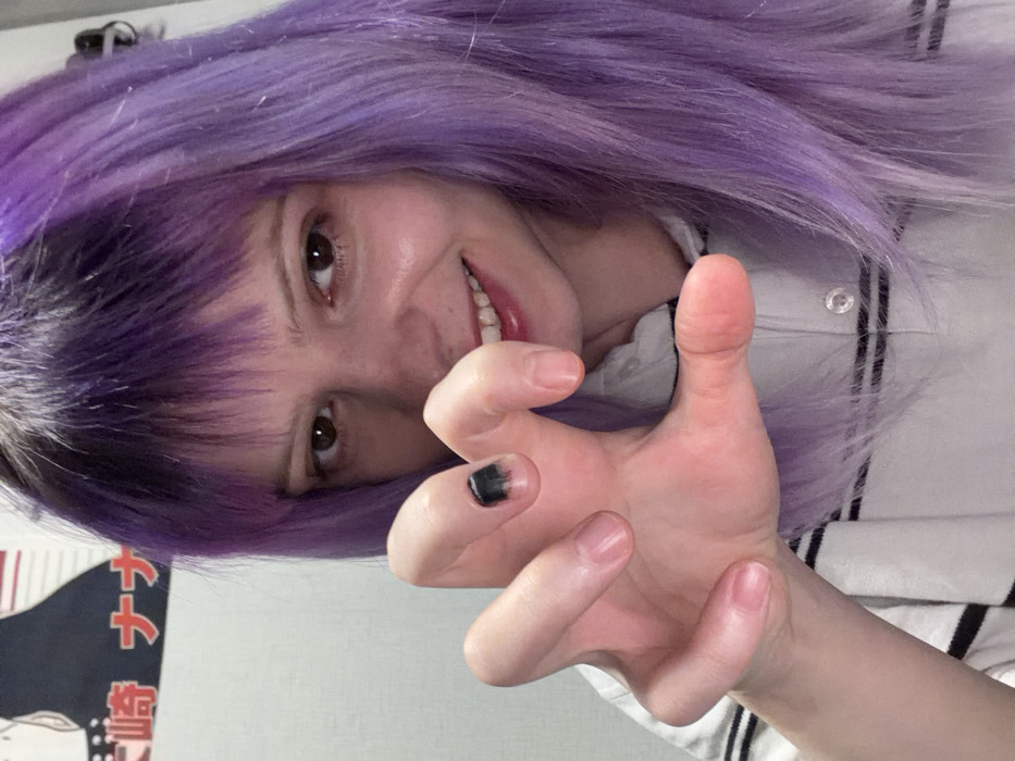 The image depicts a young female individual indoors in Lubnya, Russia. She possesses long, bright purple hair with bangs, exhibits a smile, and looks directly towards the viewer. Her right hand is positioned prominently in the foreground, curved into a claw-like gesture. The thumbnail of this hand displays a distinct solid black, square-shaped marking. She is dressed in a light-colored polo shirt with dark horizontal stripes near the collar. In the upper left portion of the background, a section of a poster featuring a monochrome illustration and visible Japanese text is affixed to a plain, light-colored wall.
