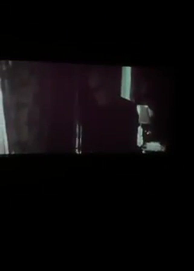 In a dimly lit interior, a person wearing glasses and a dark garment is visible. They appear to be handling a small, possibly cylindrical object. The surrounding environment is dark and somewhat cluttered, with a patterned curtain or drape visible to the left. The lighting is subdued, making it difficult to discern specific details.