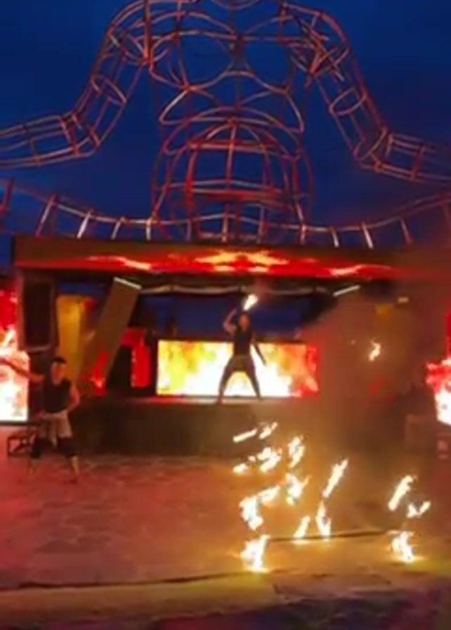 At night, three people perform a fire dancing routine in front of a stage, where a person stands in the center, partially obscured by the stage's lighting. A large, wireframe sculpture of a seated human figure looms over the stage, with the dark blue sky visible above it. The stage itself is lit with red and orange lights, enhancing the dramatic effect of the fire performance. The dancers are dressed in dark clothing with light-colored sashes. Flames erupt from the ground around them, creating bursts of light and smoke. The ground around the stage appears to be paved with stone.