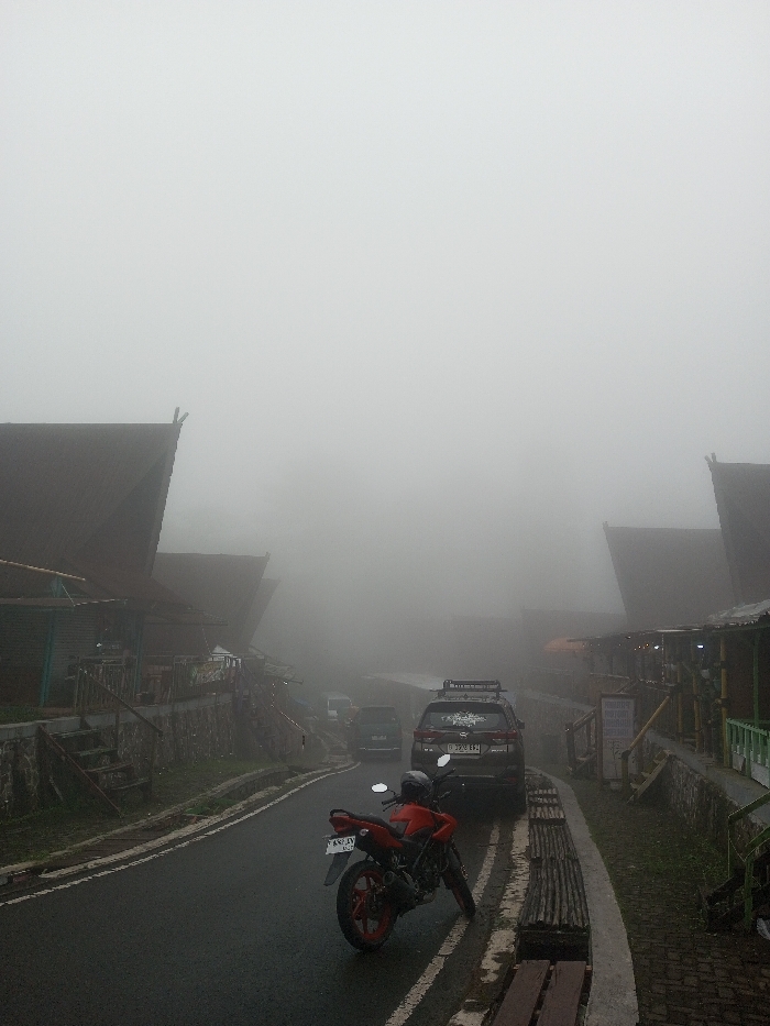 A foggy street scene shows two peaked-roof buildings lining either side of the road. An orange motorcycle is parked on the side of the road in the foreground. Behind the motorcycle, a silver SUV with a roof rack is parked. Further up the road, a dark-colored car can be seen amidst the thick fog. Benches line the road, and a sign is visible on the right. The heavy fog obscures the background and most of the scene, creating a sense of mystery.