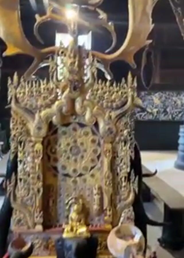 The camera pans around an interior shot of a dark room. The focus shifts from an ornately decorated altar in the center, adorned with a golden Buddha statue and surrounded by animal horns, to a large, light-colored wooden table. The table displays a variety of animal skins and skulls. In the background, an open door reveals a glimpse of greenery and blurred figures outside.
