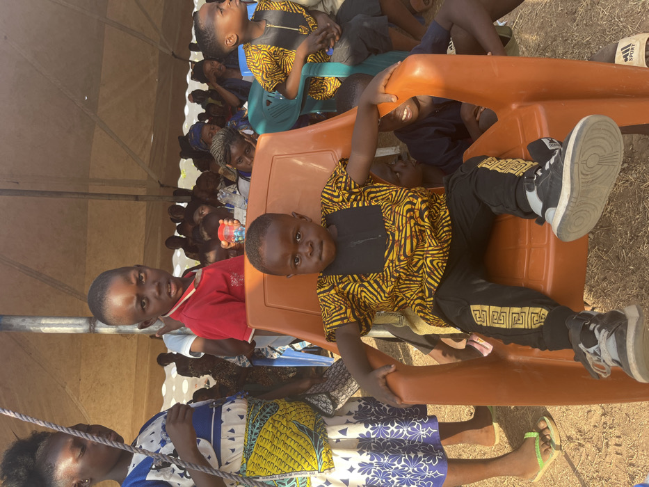 The scene depicts an outdoor gathering in Ajikemai, Nigeria, under a large, light-colored canopy. In the foreground, a young boy sits centrally on an orange plastic chair, facing the camera with a direct gaze. He wears a yellow and black patterned short-sleeved top, black pants with yellow patterns, and black and grey high-top sneakers. To his immediate left and slightly behind him, a second young boy in a red polo shirt stands, holding a multicolored cup and also looking towards the camera with a serious expression. A young girl, partially visible on the far left, wears a white and blue patterned dress with a yellow and green patterned wrap around her waist; her head is turned to the right. The ground is dry, light brown earth. In the midground and background, numerous adults and children are visible, mostly seated or standing, filling the space under the tent, indicating a communal event.