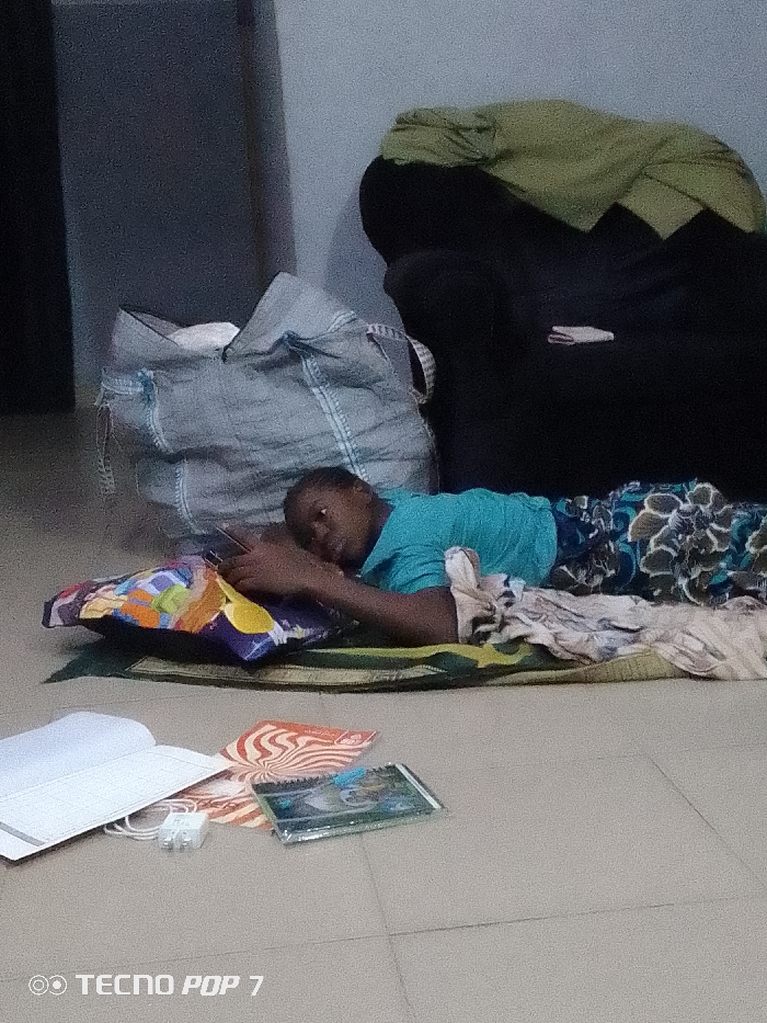 A person in a blue shirt and patterned pants rests on a colorful pillow and mat on a tiled floor. To their left is a large gray bag, and behind them is a dark-colored chair. A notebook, books, and a white plug are scattered on the floor near the bottom of the image. The scene appears to be inside a room with a light-colored wall. The words "TECNO POP 7" are visible in the lower-left corner.