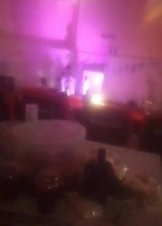 blurry view of a room, likely a banquet hall, illuminated with colored lights, primarily pink, blue, and red. In the background, figures that appear to be people can be seen standing near a brightly lit doorway or stage area. In the foreground, a table is visible, with indistinct items placed on it, possibly food or decorations. The overall setting suggests a formal event or party atmosphere with stage lighting.