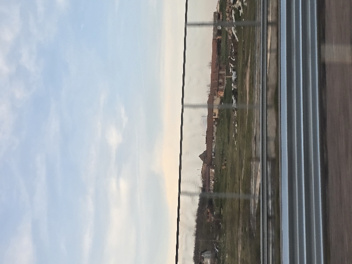 The image displays a rural landscape in Chokoba, Bulgaria, viewed from a roadside perspective. In the foreground, a three-tiered metallic crash barrier system, consisting of horizontal silver guardrails, is prominently featured. Above this barrier, a dark, blurry horizontal structure is visible, topped by a metal fence comprising vertical posts and a horizontal top bar. The midground consists of a gently sloping expanse of green and brown grass, showing patches of bare earth and scattered debris, including white and dark colored piles. In the background, a cluster of low-rise buildings with reddish-brown tiled roofs forms a settlement on a distant rise. A larger, darker building with a distinct roof profile is discernible within this cluster. The sky occupies the upper portion of the frame, exhibiting a pale blue hue with scattered white and light grey clouds, and a subtle orange gradient near the horizon line. No individuals or active subjects are visible.