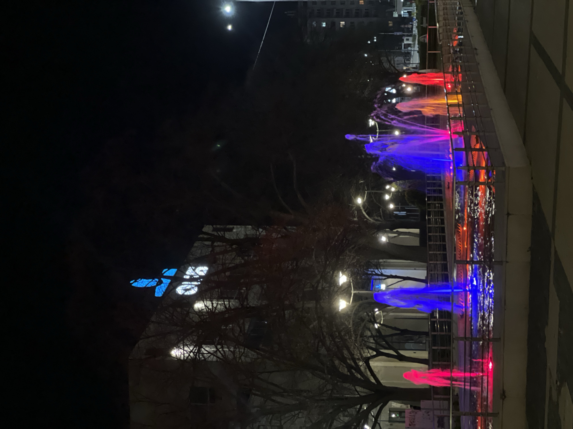 At night in Pernik, Bulgaria, a water fountain is illuminated with red, blue, and orange lights. The fountain is situated in an urban environment, indicated by buildings in the background and street lights. A metal railing surrounds the fountain. Bare trees are in the foreground, obscuring some of the view.