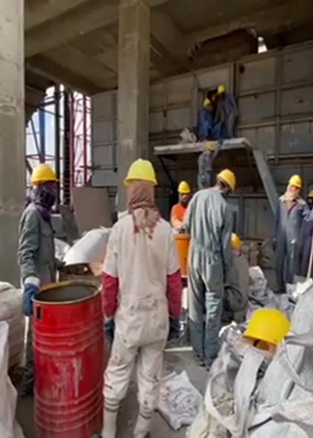 group of construction workers in a large, unfinished concrete structure. The workers are wearing hard hats and overalls, and some are wearing masks. They are working near a large, metal bin, with some workers on a platform accessing the bin. There are also large bags of materials, a red barrel, and other construction equipment scattered around the area. The building appears to be a large industrial structure.