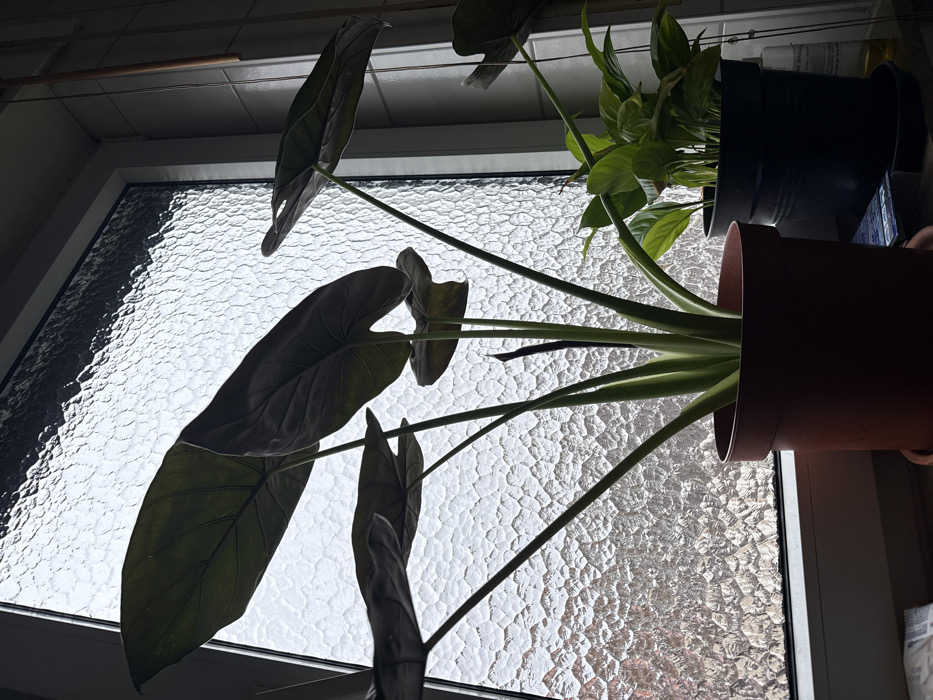 The image depicts an indoor scene in Bad Nauheim, Germany, focused on two potted plants situated on a windowsill. The prominent subject is a large Alocasia plant in the left and central foreground, characterized by several dark, broad leaves with visible veins and tall, slender stems. This plant is contained within a terracotta-colored plastic pot, resting on a matching saucer. To its right, a second, smaller plant with lighter green foliage is visible in a dark gray or black plastic pot, also on a saucer. Both plants are positioned in front of a window featuring textured, obscure glass, which diffuses light from the exterior. The window frame is white. To the far right, a tiled wall is visible, along with a thin vertical wooden rod and a bottle equipped with a white pump dispenser on the windowsill surface. The scene is backlit, creating silhouettes of the plants against the bright, diffused light from outside the window. No individuals are present in the frame.