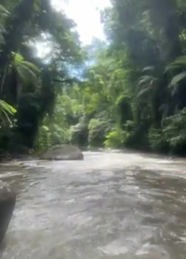 river flowing through a lush green forest. The water is turbulent, with white froth visible, suggesting a fairly rapid current. Large rocks are scattered in the riverbed. The trees are dense and create a canopy overhead, allowing light to filter through. The overall impression is one of a natural, undisturbed tropical environment.