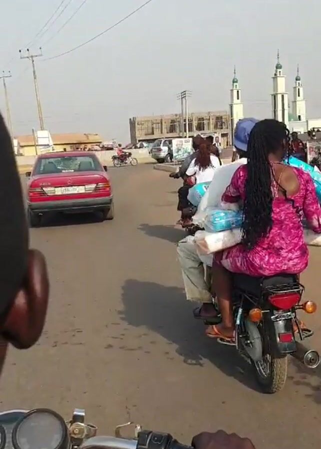 A motorcyclist filmed a video of a street in a town or small city. The street has a red car parked on the left side of the road. A motorcycle ahead of the camera operator is carrying a passenger who is holding multiple packages of diapers. Across the street, there are political signs on the side of the road and a white mosque in the background. There are people walking along the sidewalk near the mosque.